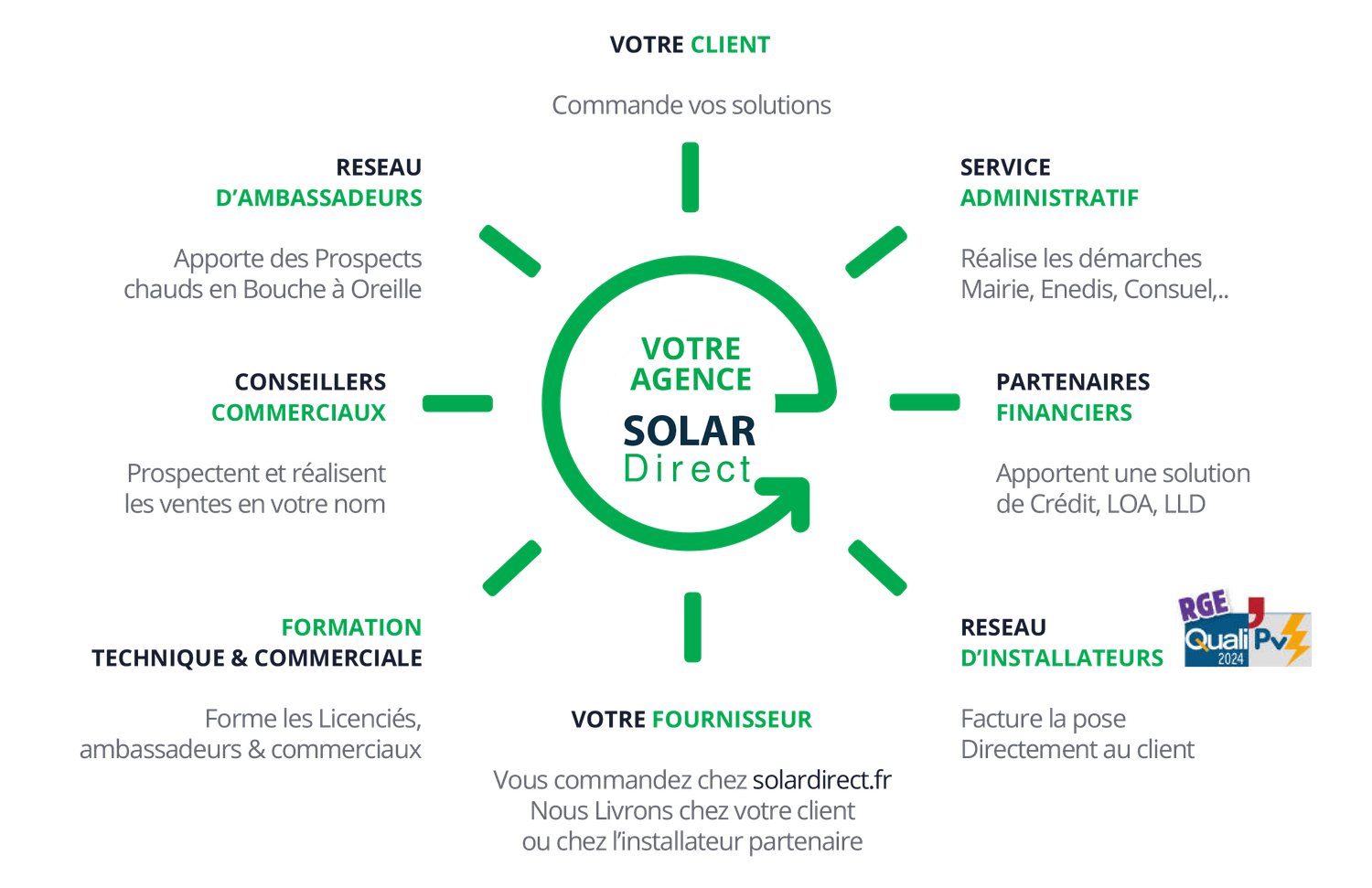 C'est la raison pour laquelle j'ai créé SOLAR DIRECT GROUPE, la société dédiée au développement de la licence de marque SOLAR DIRECT que je partage en la licence de marque avec des outils, un marketing puissant, des produits novateurs en forte demande pour accompagner ceux qui souhaitent se lancer dans le business du solaire sans avoir à démarrer de zéro !